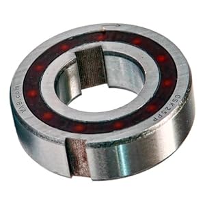 A sprag clutch is a one-way freewheel clutch. It resembles a roller bearing, but instead of cylindrical rollers, non-revolving asymmetric figure-of-eight shaped sprags are used. When the unit rotates in one direction the rollers slip or free-wheel, but when a torque is applied in the opposite direction, the rollers tilt slightly, producing a wedging action and binding because of friction. The sprags are spring-loaded so that they lock with very little backlash.