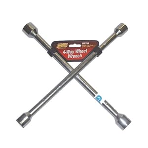 A lug wrench is the name for a type of socket wrench used to loosen and tighten lug nuts on automobile wheels. In the United Kingdom, this tool is commonly known as a wheel brace or wheel wrench. Lug wrenches may be L-shaped, or X-shaped. The form commonly found in car trunks is an L-shaped metal rod with a socket wrench on the bent end and a prying tip on the other end. The prying tip is mainly intended to remove hub caps or wheel covers that may be covering a wheel's lug nuts. Another common type, sometimes called a spider wrench, is made in the shape of a cross with different sized sockets on each of the four ends. Technique. Ideally, the nuts (or bolts) should be tightened with a torque wrench. Lug wrenches are much less expensive because they lack the ability to measure or limit the force used. Installing a wheel with a lug wrench thus requires a bit of rough guessing about proper tightness. Excessive force can strip threads or make the nuts very difficult to remove. Also, uneven torque between the various lug nuts, or excessive torque, can lead to warping of the brake rotor if the car is equipped with disc brakes[citation needed]. For this reason, impact wrenches should properly be used only for removing lug nuts, not for tightening them, although in practice this rule is often ignored for convenience's sake, even by professional mechanics.